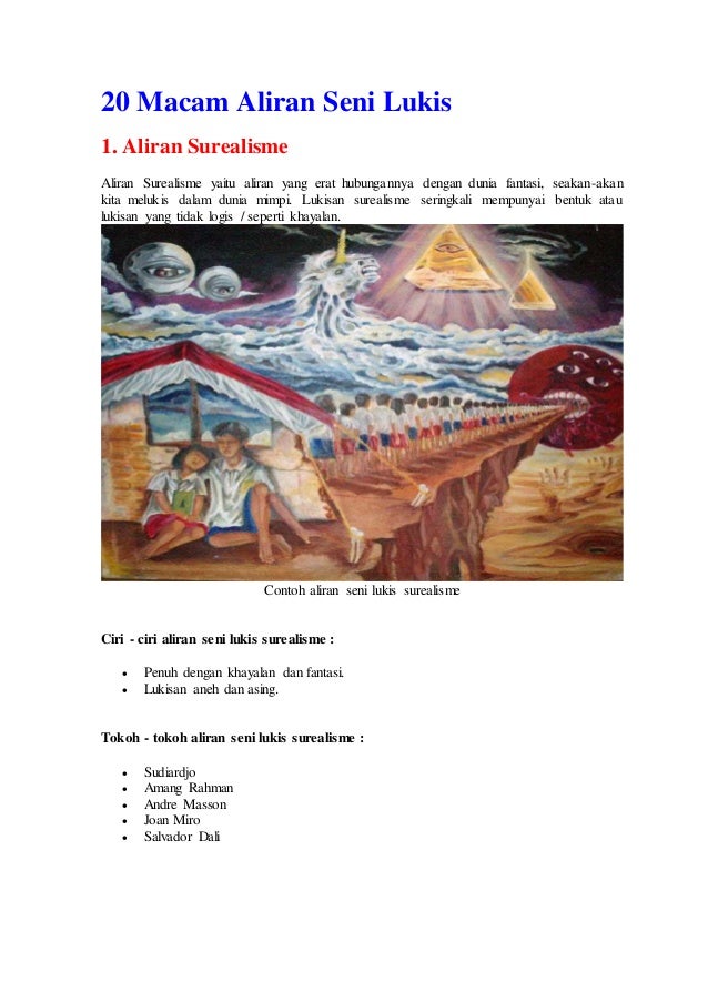 Surealisme adalah bentuk imajinasi khayalan yang figuratif yang dikreasikan menjadi sebuah karya seni 2 lukisan aliran surealisme merupakan salah satu jenis lukisan yang unik dan populer ketika. Pelukis berusaha mengabaikan bentuk secara keseluruhan kemudian mengolah setiap. Pengertian seni lukis, teknik, contoh, beserta penjelasan lainya lengkap ! Lukisan surealisme juga biasanya memiliki bentuk atau lukisan yang tidak logis serta seperti khayalan. Surrealisme adalah sebuah lukisan realisme atau naturalisme yang berupa daya khayal dan sesuatu.